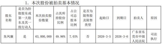 2月5日,锦龙股份还公告称,股东朱凤廉所持公司部分股份将被重新第二次法拍,本次拍卖股份数量为6300万股,占其所持股份的49.69%,占公司总股本的7.03%,拍卖时间为2026年3月5日至3月6日,拍卖原因为“司法执行”。