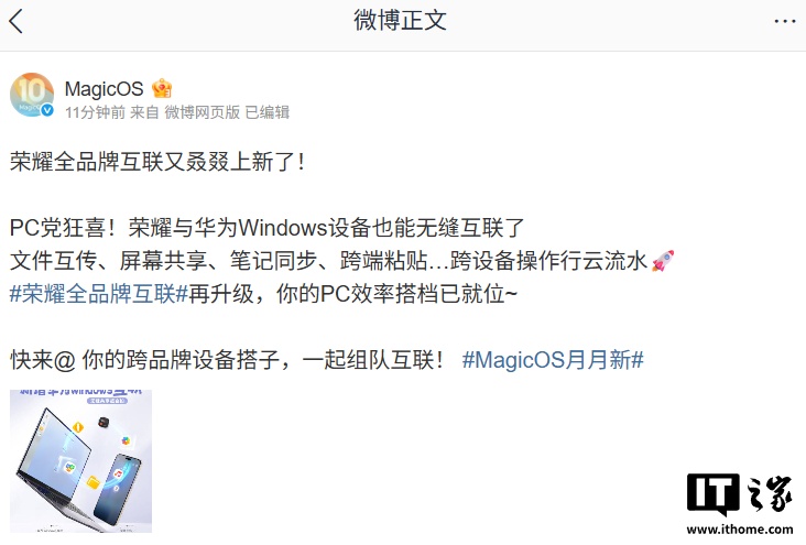 IT之家 1 月 12 日消息,MagicOS今日宣布荣耀全品牌互联又上新了,荣耀与华为 Windows 设备也能无缝互联了,支持文件互传、屏幕共享、笔记同步、跨端粘贴等跨设备操作。